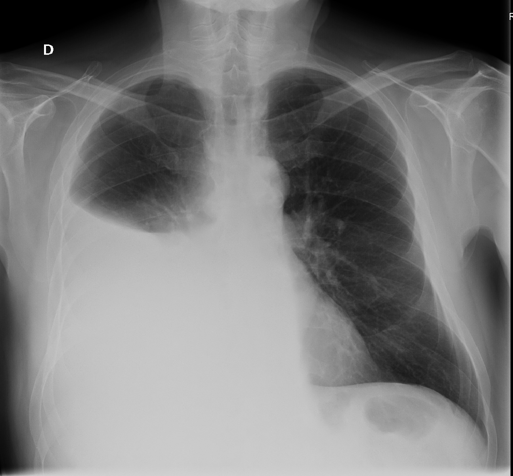 En exploración física presenta palidez cutánea, pérdida de peso (12 kg/año). Saturación 95%. AP: marcada hipoventilación derecha con crepitantes medio-basales. Abdomen sin hallazgos.