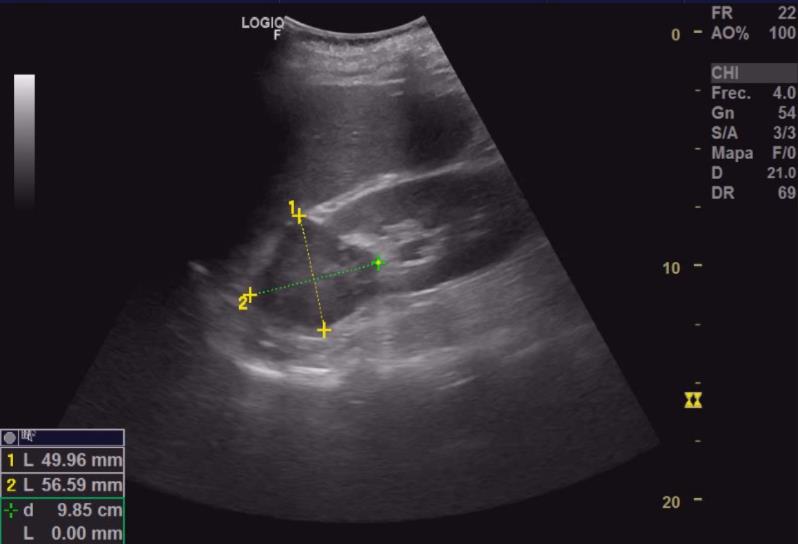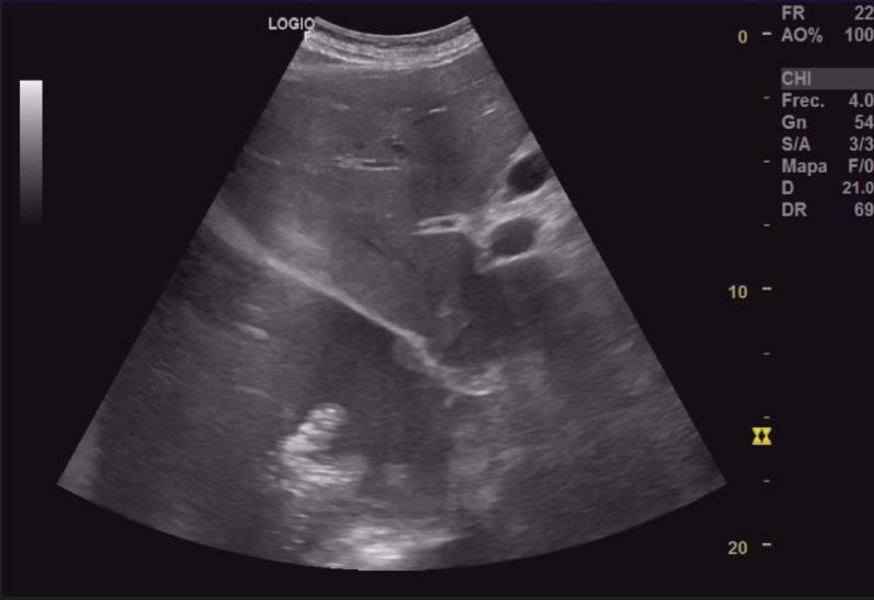 Conociendo la tendencia del paciente a minimizar síntomas y evidenciando un acusado cambio físico, realizamos ecografía intraconsulta.