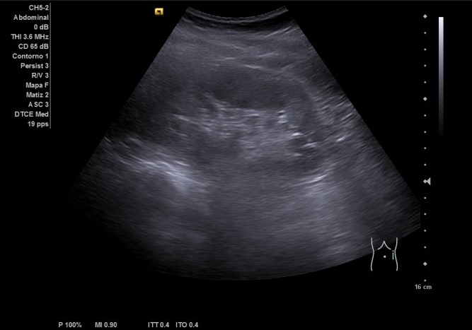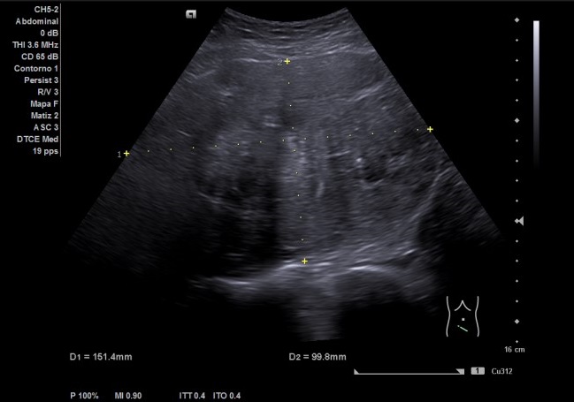 Riñón izquierdo tamaño y ecoestructura normal. Se visualiza vejiga con paredes homogéneas y ambos jets. Útero en anteversión, con mioma de 15,14 x 9,98 cm. Anejos normales.