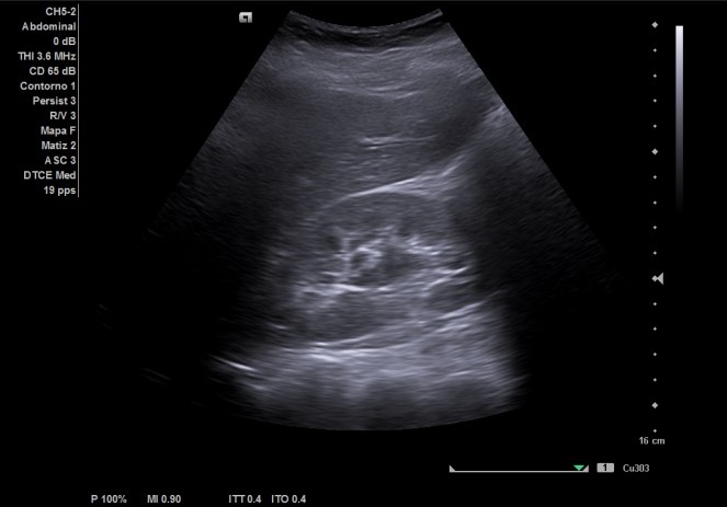 Riñón derecho ligeramente aumentado de tamaño con aparente hidronefrosis grado 1-2.