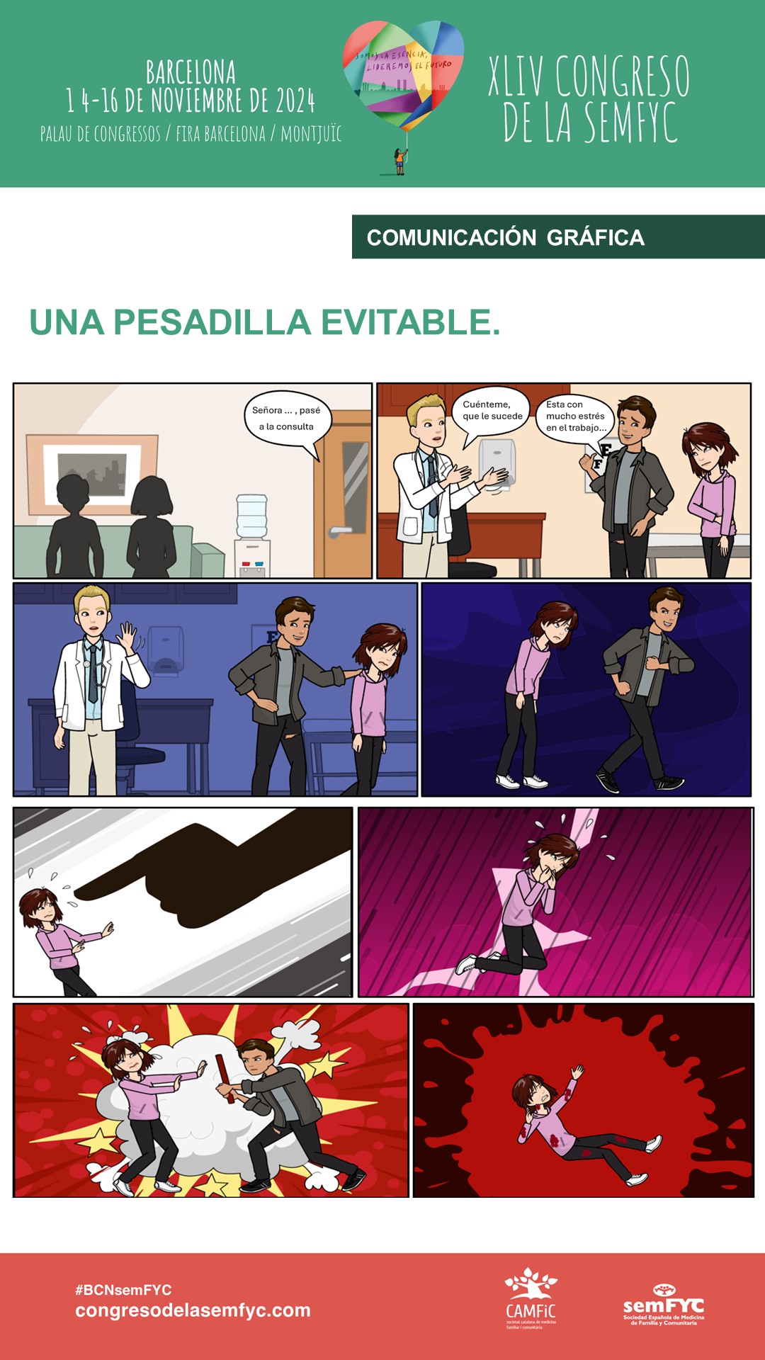 La siguiente comunicación gráfica consiste en una breve historieta que a lo largo de 8 viñetas busca exponer una falta de preparación y de sospecha por parte del personal sanitario a situaciones que conllevan la vulnerabilidad de los derechos del paciente, como lo es en este caso la violencia machista.