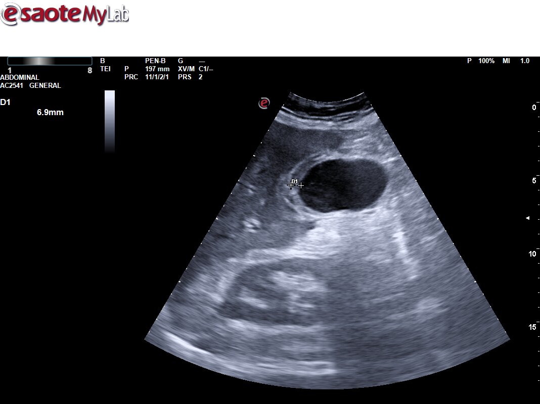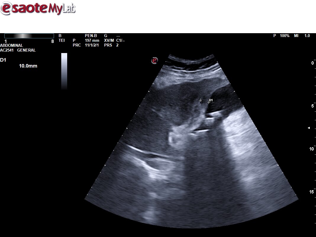 Ecografía primaria. Se aprecia vesícula con aumento de la pared de la vesícula biliar de unos 10 mm, con signos flogóticos (aumento de captación Doppler y líquido libre perivesicular), con contenido hiperecogénico en su interior con sombra posterior, y dilatación de vía intrahepática. Vía extrahepática no valorable por interposición de gases. Colecistitis. Dilatación de vía intrahepática.