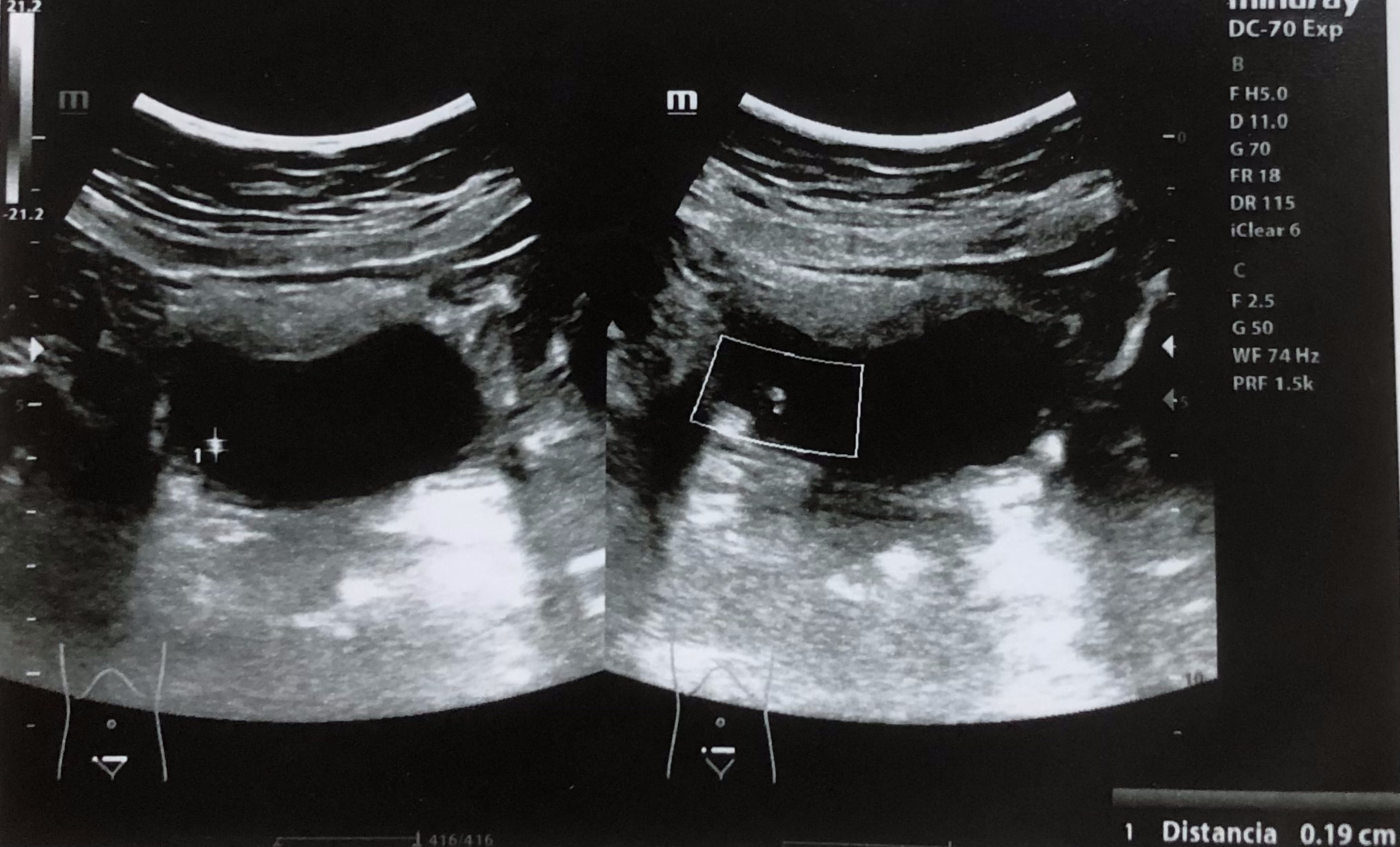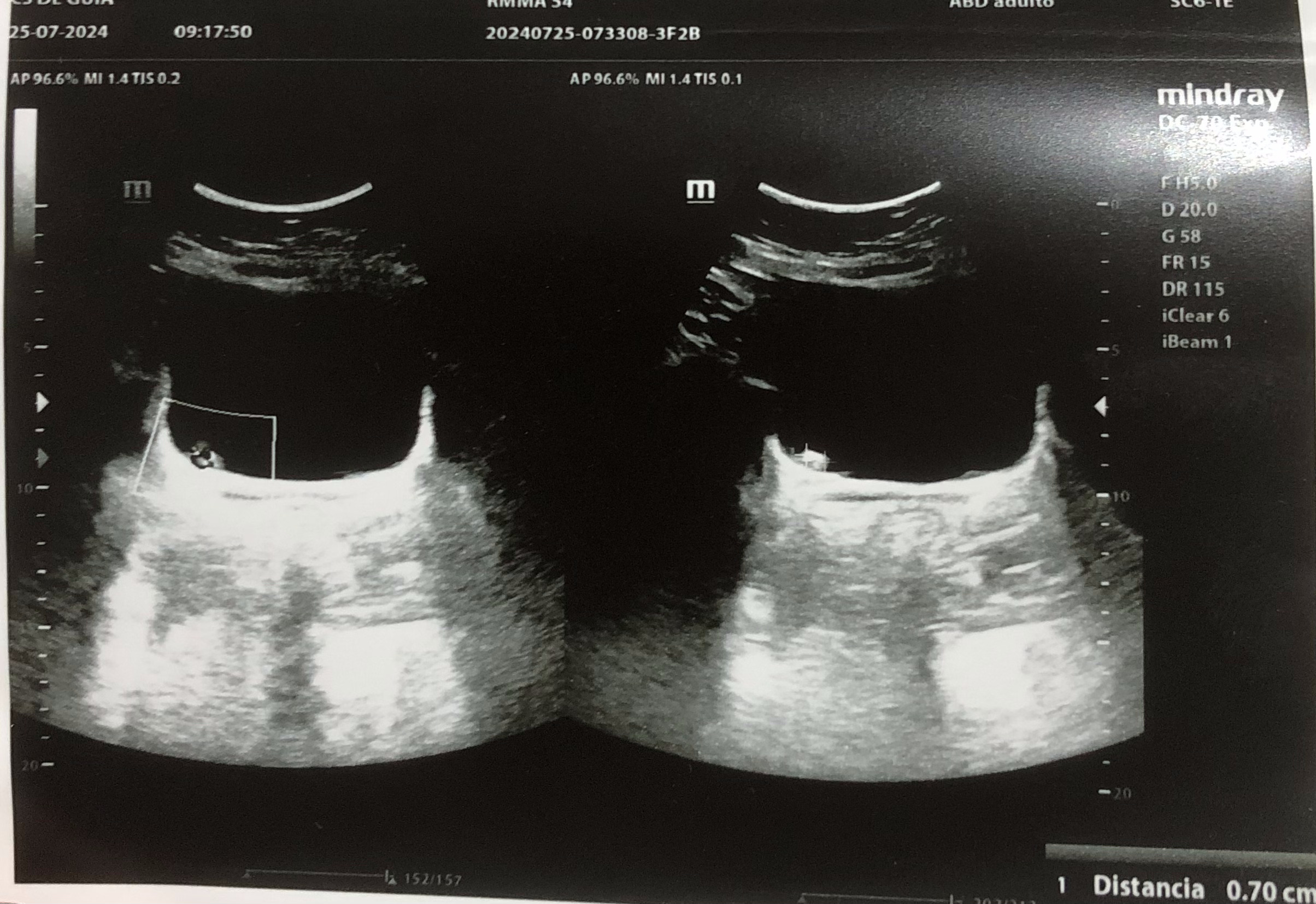 Se realiza ecografía renal donde se aprecia lesión hiperecogénica redondeada en pared inferior derecha de vejiga sin sombra posterior de 0,7 x 0,61 cm, que no se moviliza con cambios posturales de la paciente. Centelleo dudoso.