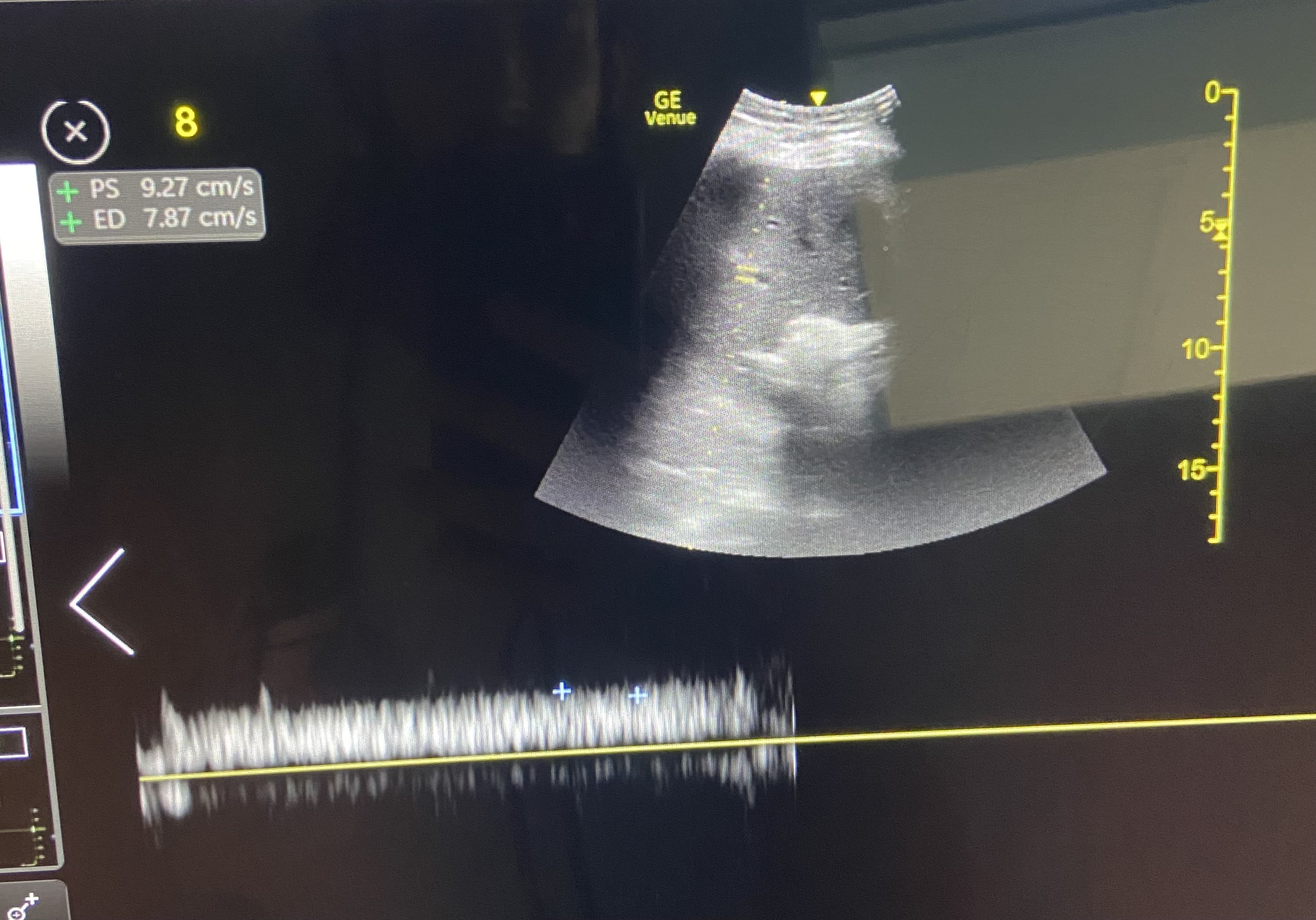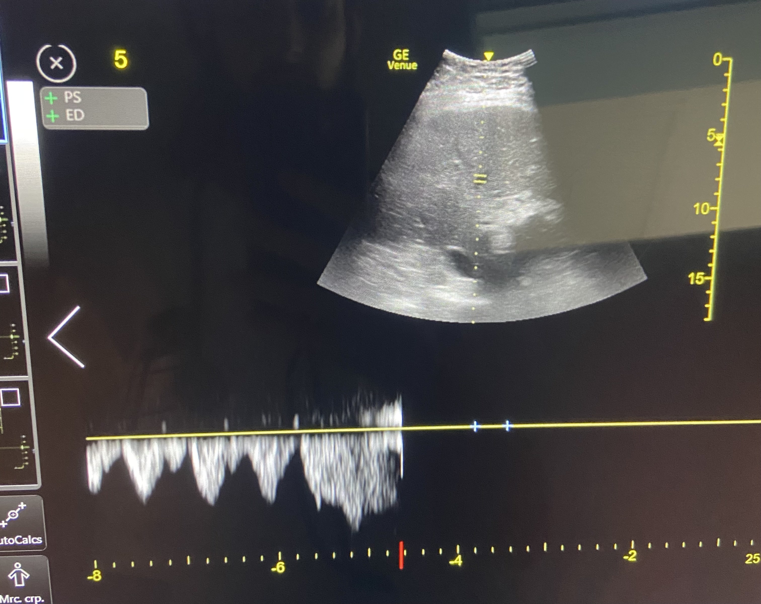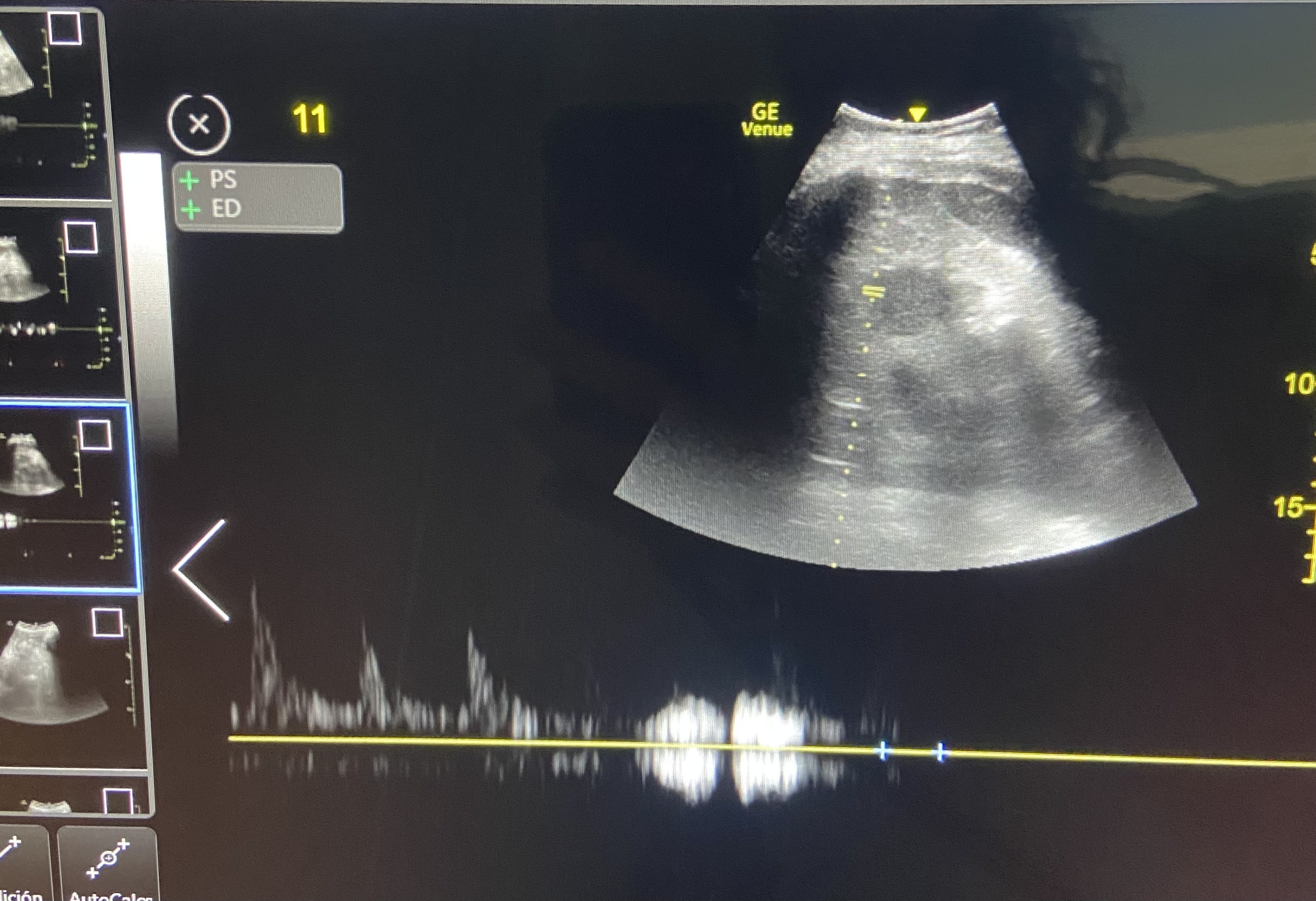 Paciente hombre de 85 años con antecedentes de insuficiencia cardiaca. Acude a urgencias por disnea progresiva de 48 horas de evolución, precedida por 10 días de ingesta deficiente. En la exploración física, presenta crepitantes bibasales hasta campos medios, edemas hasta rodillas, mucosas secas y signo del pliegue positivo. La tensión arterial es de 107/65 mmHg. Los análisis sanguíneos revelaron una creatinina de 1.8 mg/dL y un NT-proBNP de 5500 pg/mL, con una fracción de excreción de urea de 32%, compatible con origen prerrenal. Ante la aparente contradicción, se realiza una ecografía PoCUS dirigida. La vena cava inferior mostró un diámetro máximo de 2,13 cm con colapsabilidad en inspiración, y el Doppler de venas suprahepáticas, venas porta e intrarrenales no evidenció signos de congestión. En conjunto, los hallazgos configuraron un perfil VExUS Grado 1.