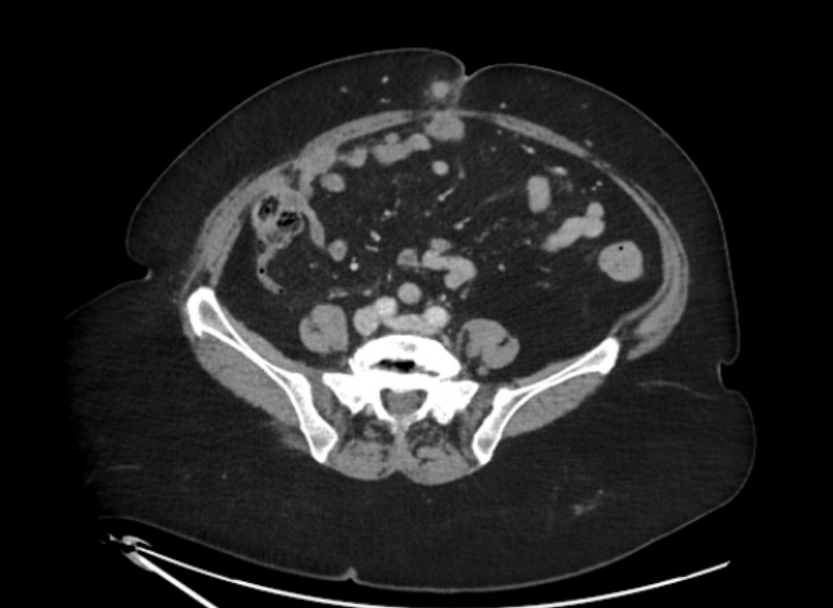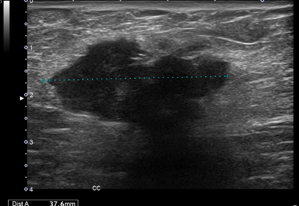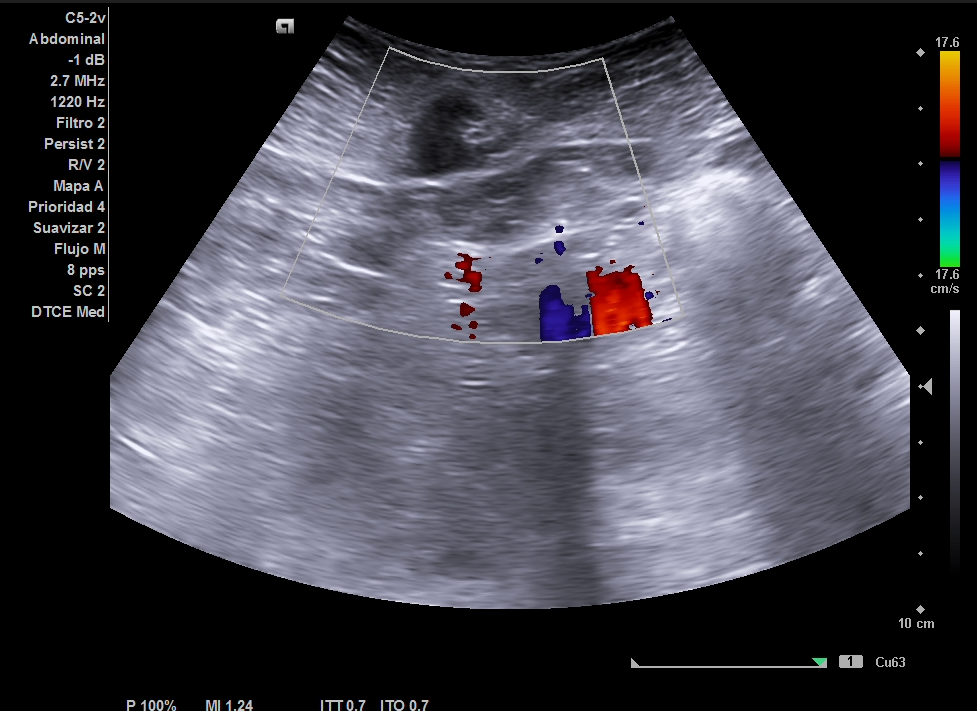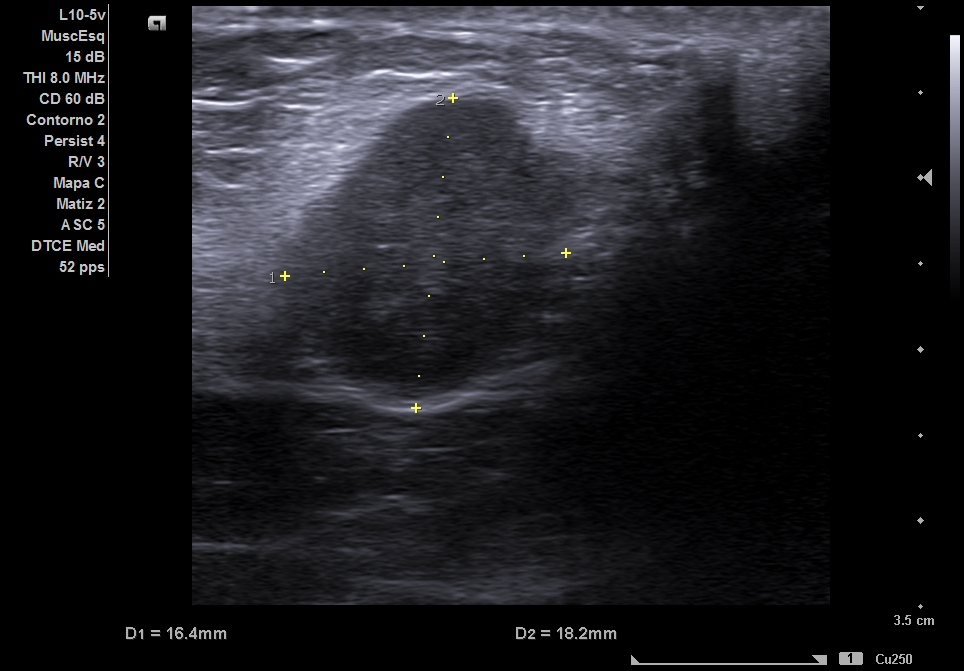 Ecografía clínica partes blandas y abdominal en Centro de Salud: dos nódulos subcutáneos hipoecogénicos, heterogéneos, lobulados y de bordes irregulares (16 x 18 mm), no vascularizados. Abdomen: sin signos patológicos relevantes ni Ascitis ni líquido en Douglas no adenopatías retroperitoneales. Completamos estudio de nódulos sospechosos de malignidad con tomografía abdominal y ecografía de partes blandas reglada.