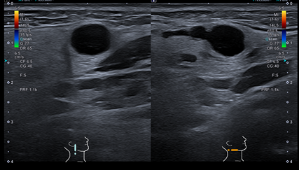 Señal doppler dudosa. Junto a esta lesión se visualiza otra de similares características, pero de menor tamaño.