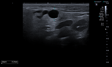 Se realiza ecografía clínica que muestra una imagen redondeada de márgenes regulares hipoecoica de 7,7 mm, sin tabicación y con refuerzo acústico posterior, que parece localizada en la glándula parótida derecha.