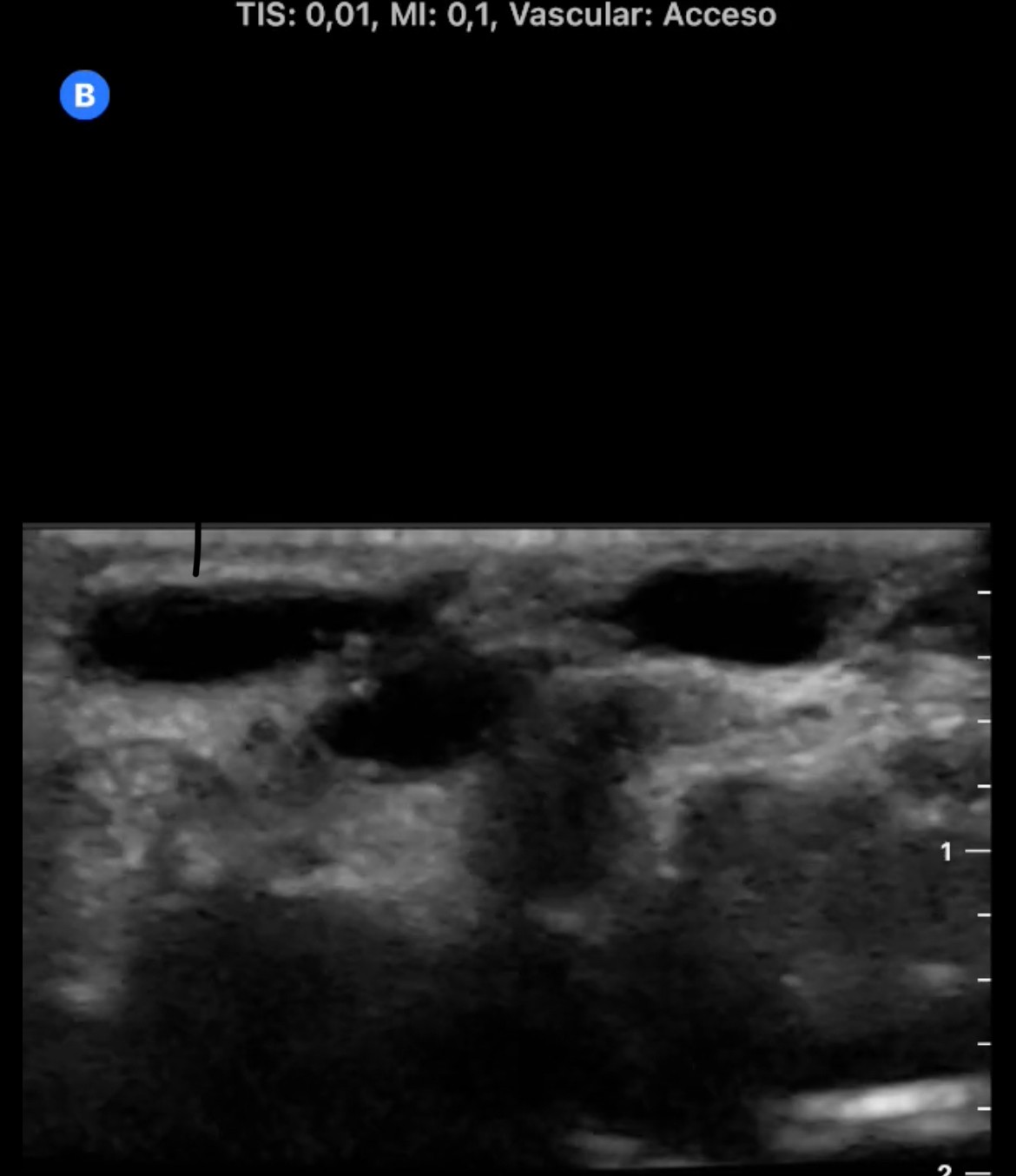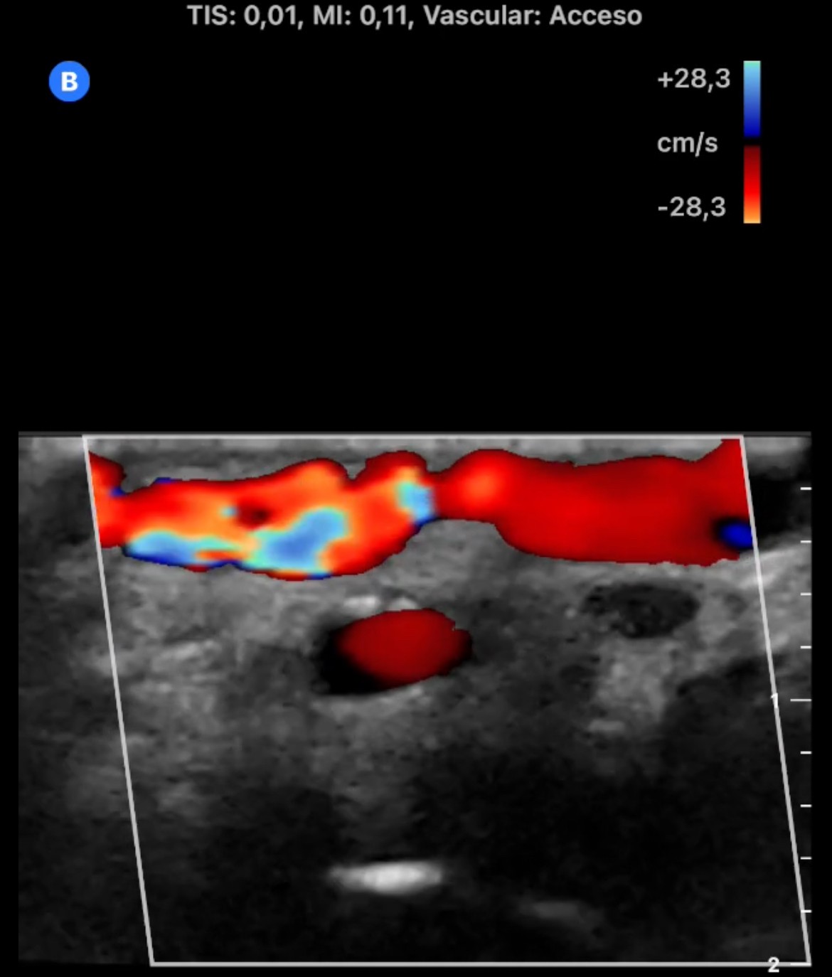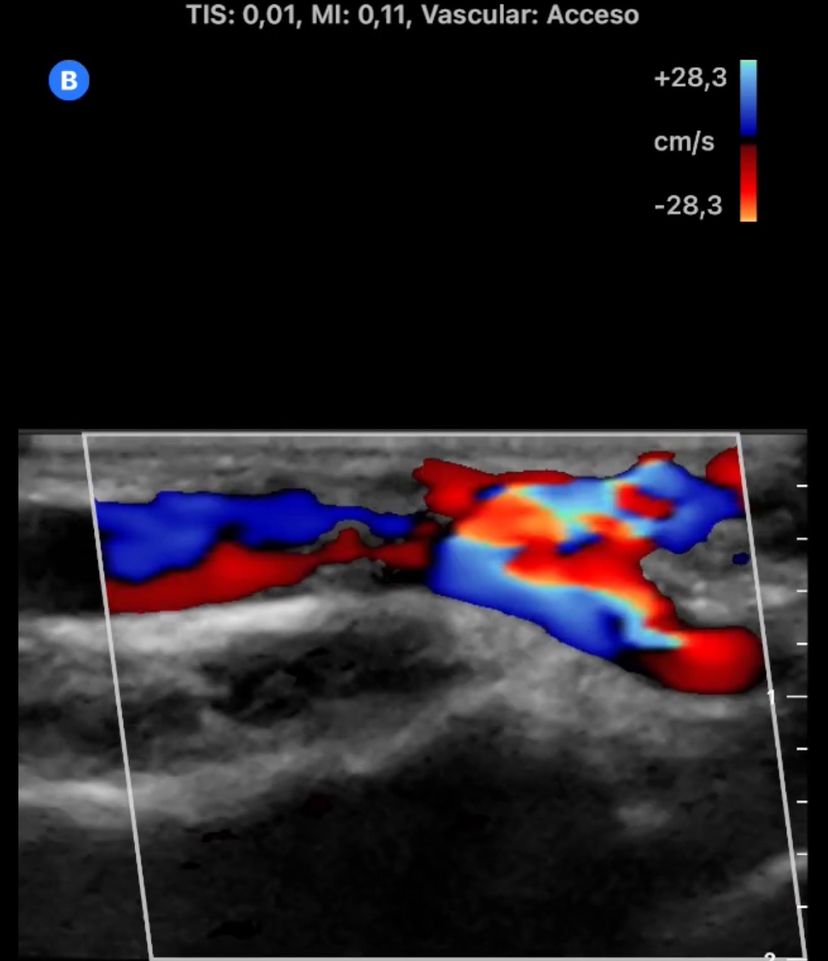 En la cara palmar de la muñeca derecha se aprecia un aumento de tamaño de las venas superficiales con flujo Doppler color en su interior. En arteria radial se observa flujo muy turbulento con comunicación de arteria radial con una vena superficial del antebrazo.
