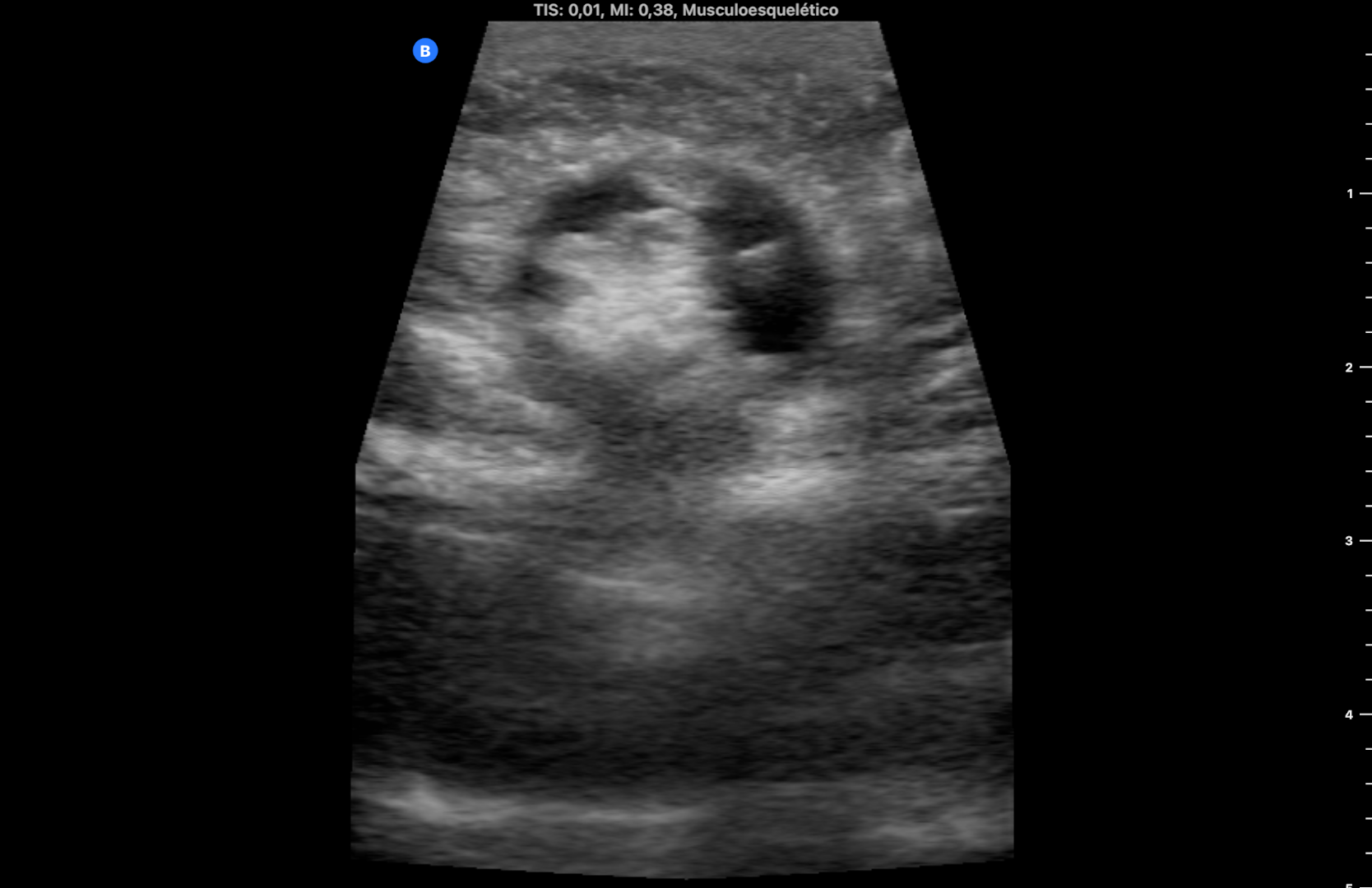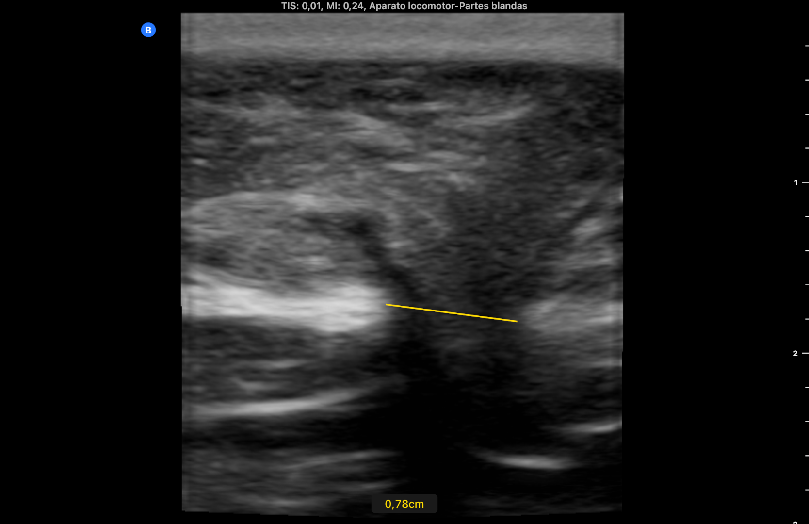 Se utiliza en la misma consulta una sonda portátil con preset de partes blandas, observando una imagen heterogénea redondeada, rodeada de líquido anecogénico a nivel subcutáneo que rompe la línea alba (imagen 1). Durante la exploración se comprime con la sonda en el lugar de la imagen consiguiendo la reducción de la misma y desapareciendo el dolor. La ecografía muestra entonces la discontinuidad de la línea alba con una pequeña protrusión de grasa (imagen 2) (se dispone de vídeos).