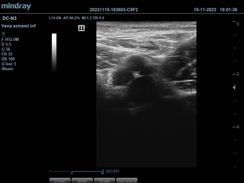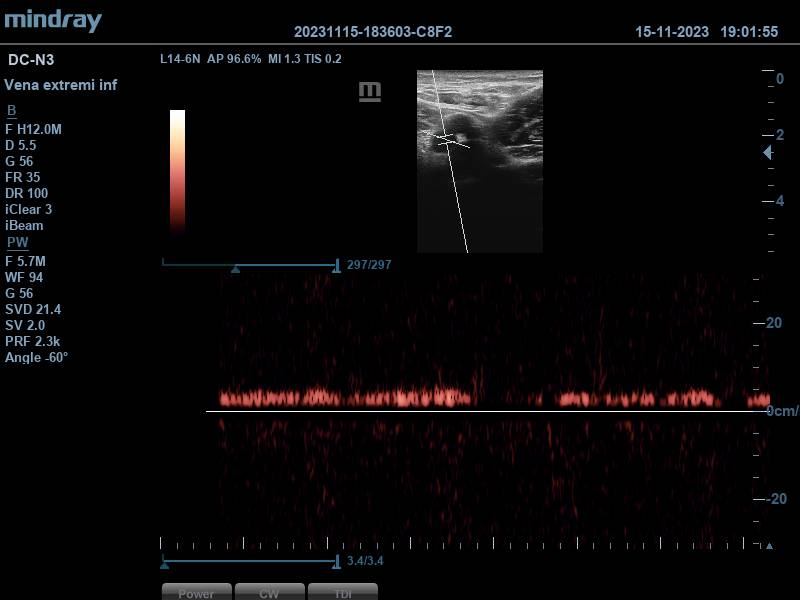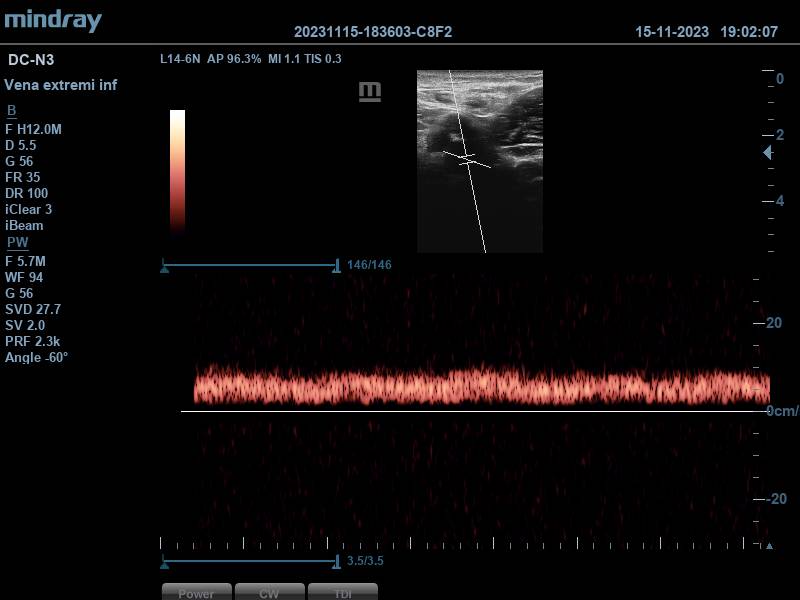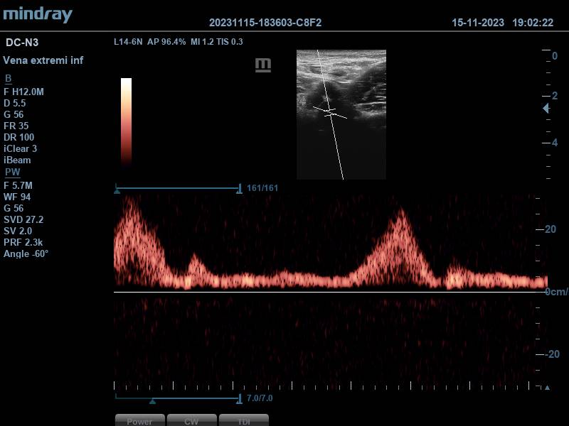 Ante este hallazgo se procede a realizar la ecografía realizando compresiones por ambas venas femorales, encontrándolas ambas compresibles. Se completa estudio a nivel poplíteo, donde solo se observa una vena poplítea, compresible también.